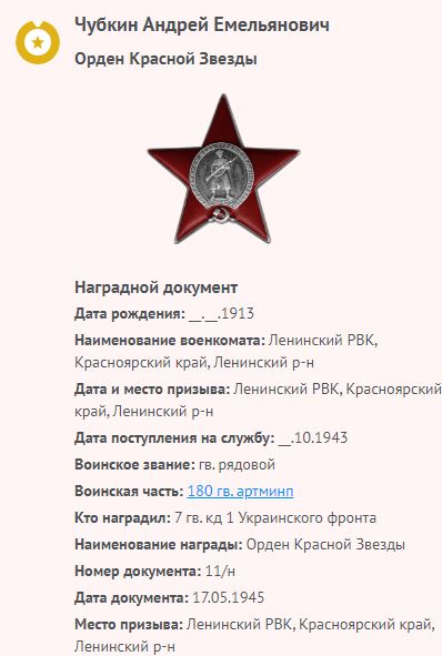 Дата и место призыва: __.__.1943 Ленинский РВК, Красноярский край, Ленинский р-н