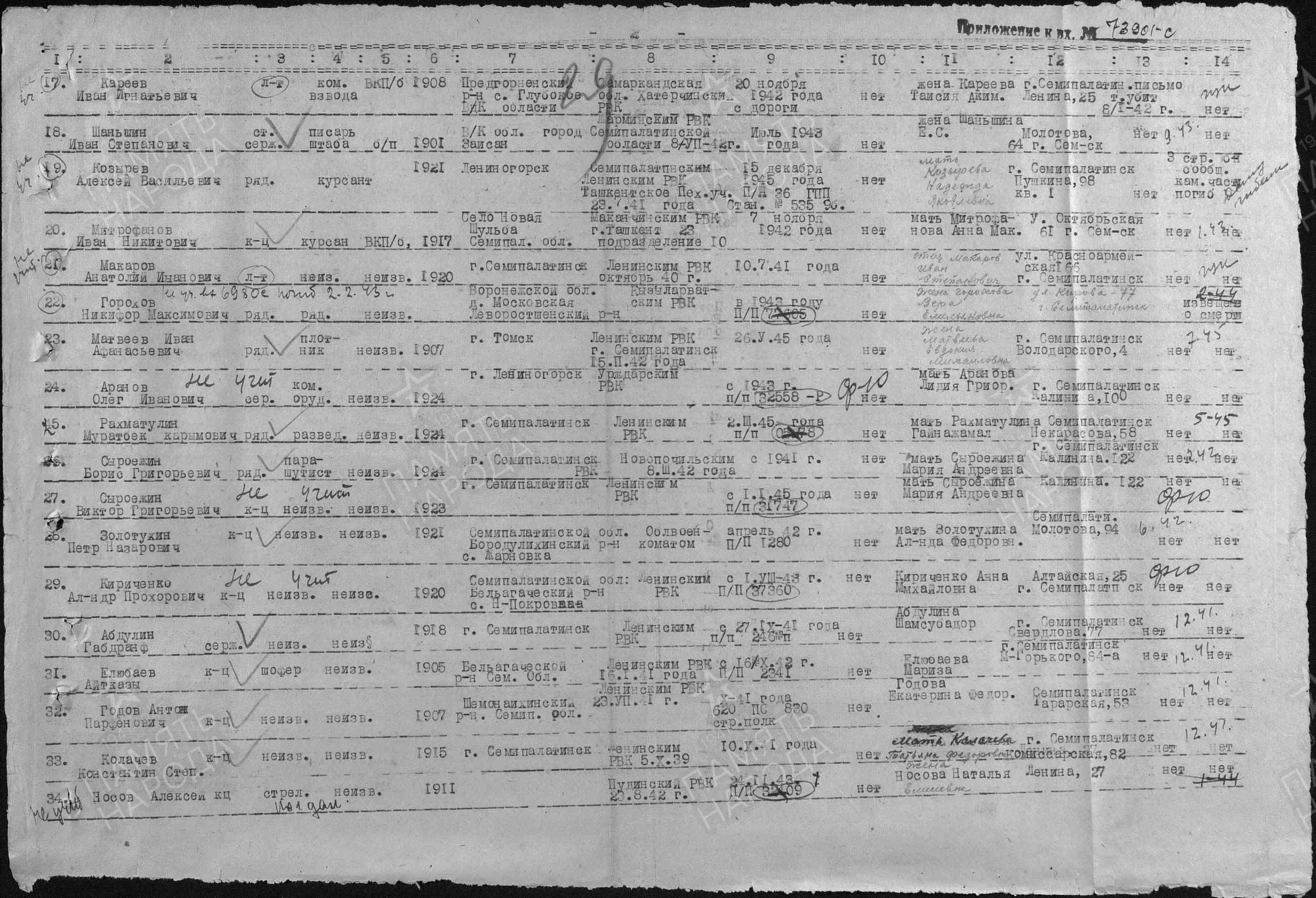 Дата и место призыва: Ленинский РВК, Казахская ССР, г. Семипалатинск, Ленинский р-н