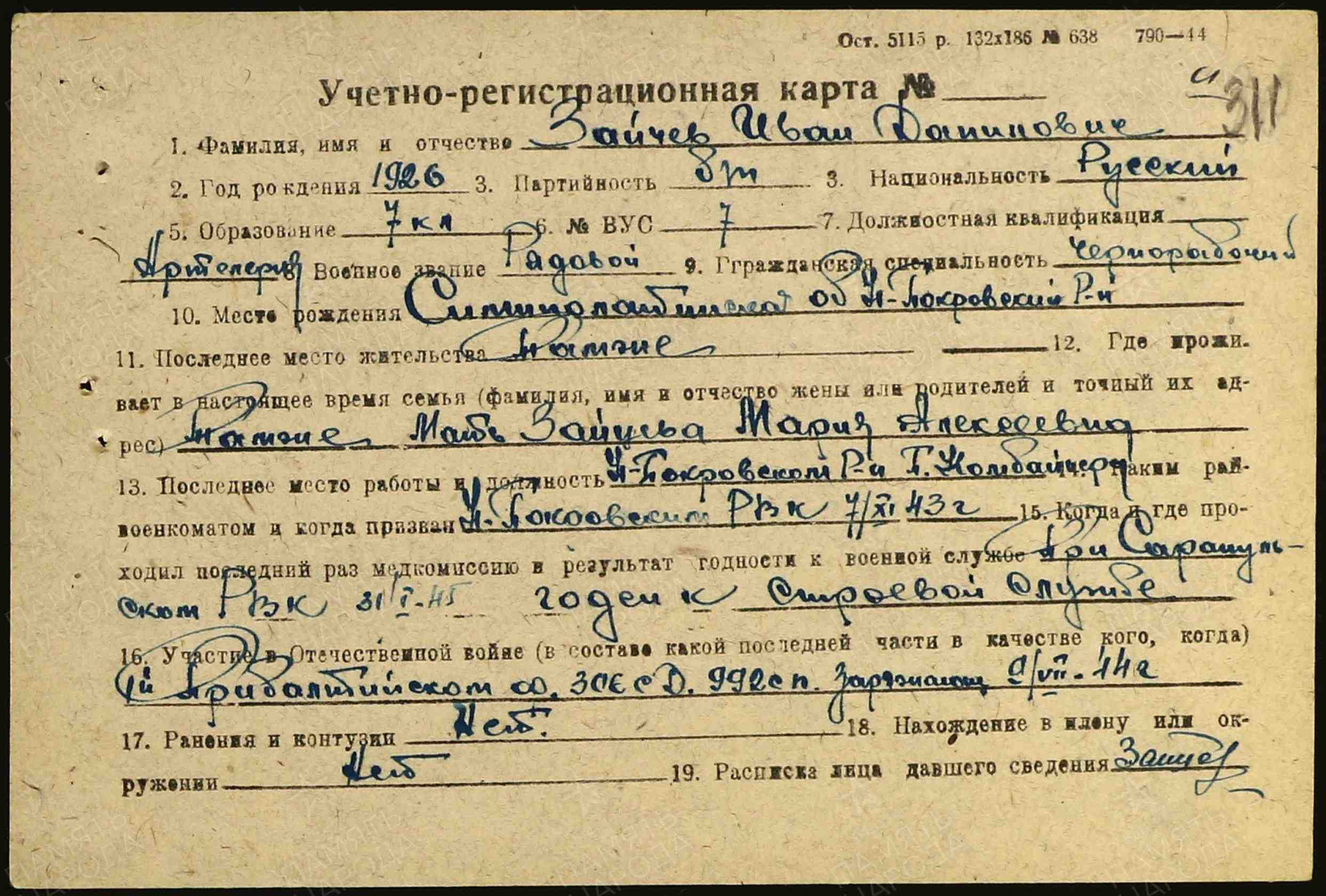 Последнее место службы: 992 стрелковый полк 306 стрелковой дивизии (II)